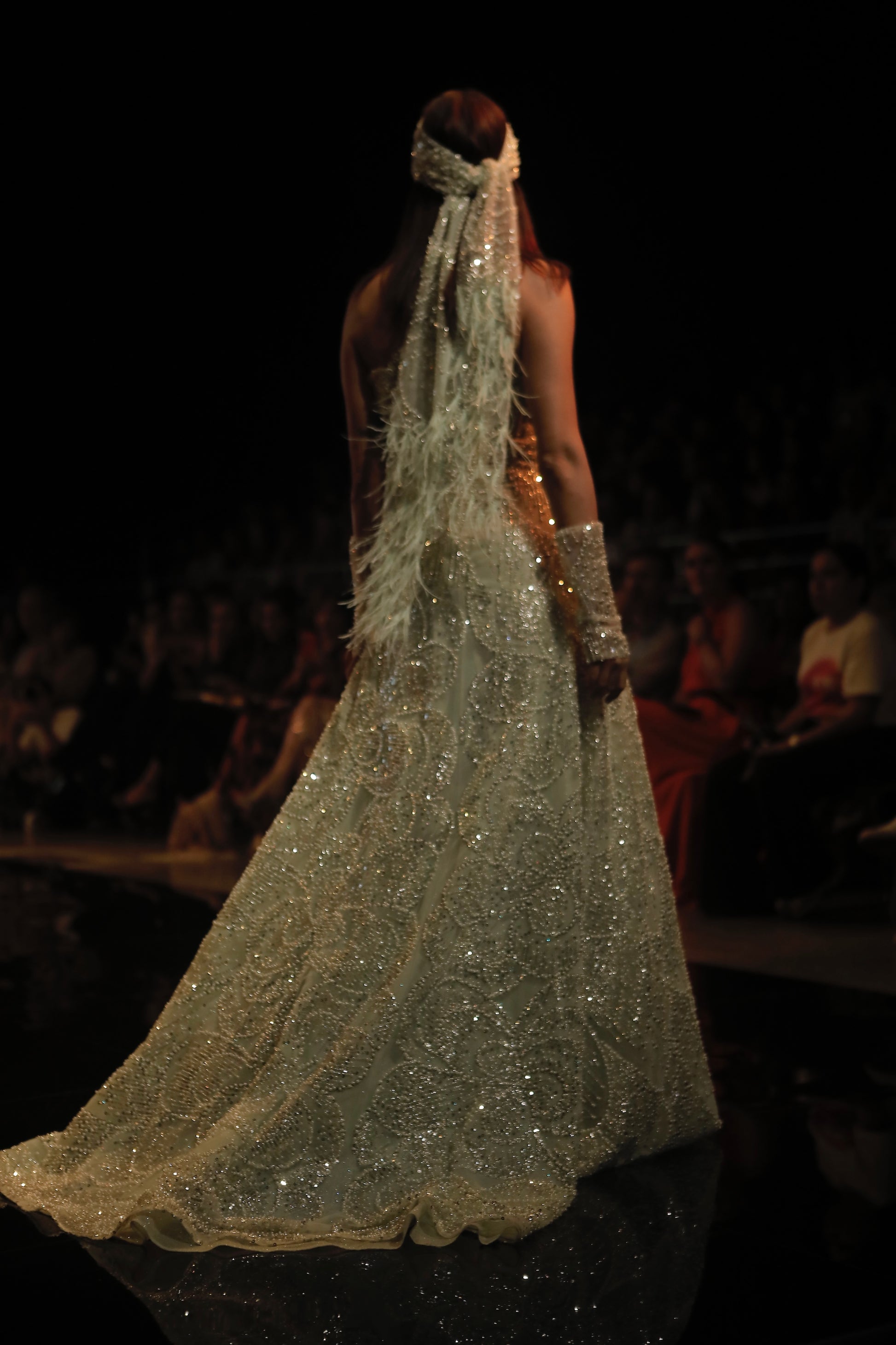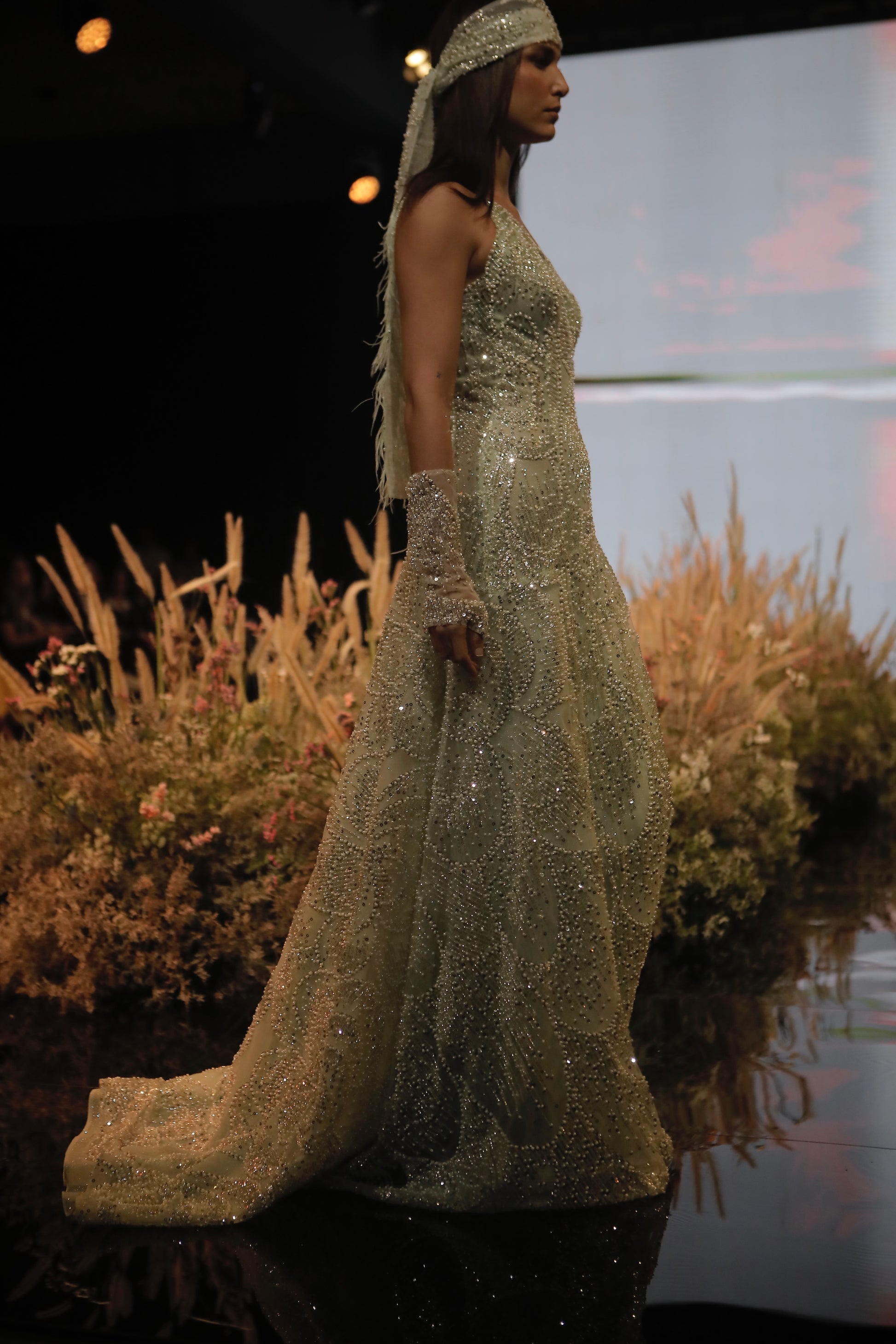 Vestido en tono aqua con escote asimétrico, bordado con cristales que dibujan patrones ondulantes sobre una base translúcida. Su silueta fluida y la caída sutil de la falda crean movimiento con cada paso. El velo adornado con plumas y brillos complementa el look, evocando una elegancia etérea que combina fuerza y delicadeza.