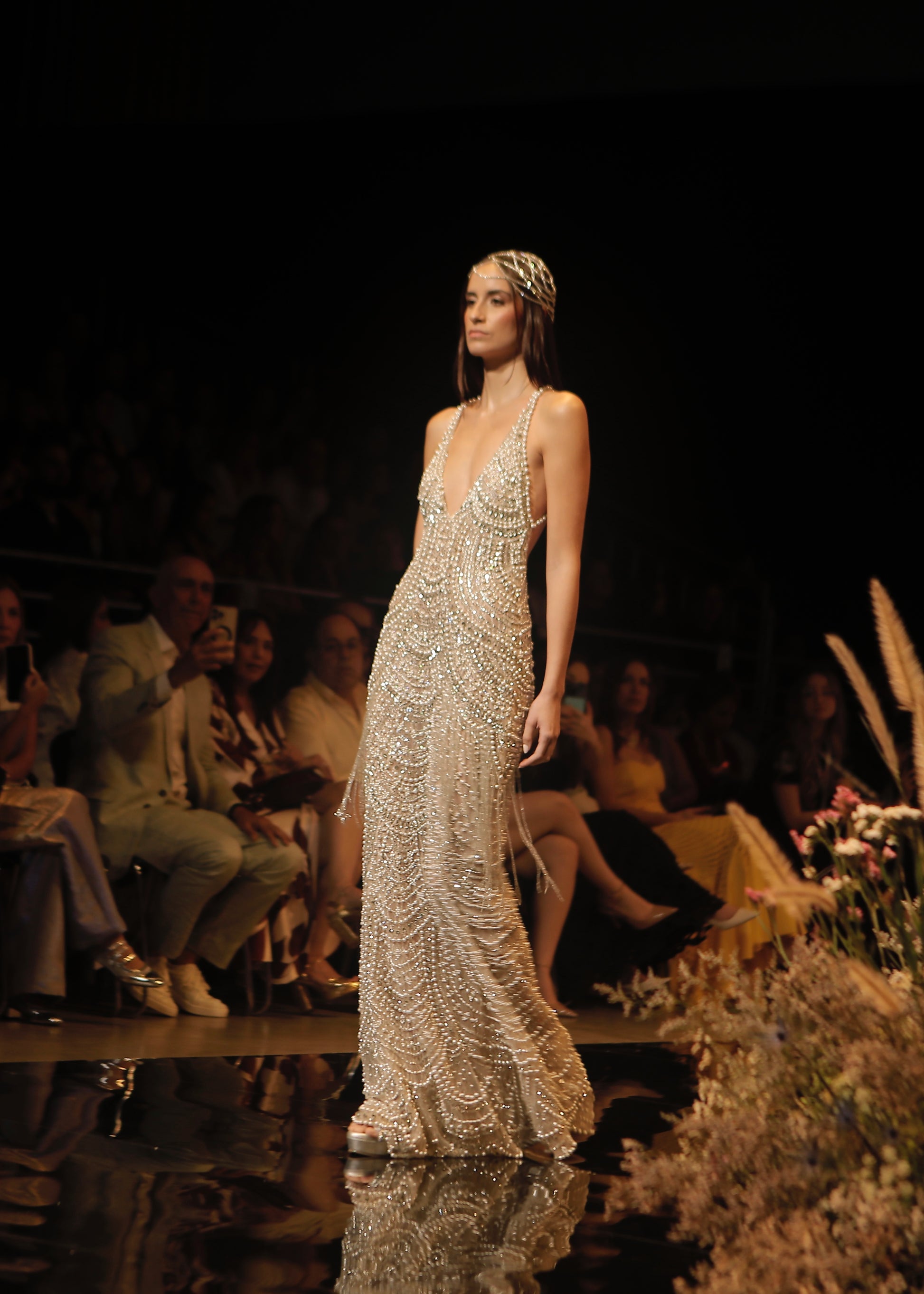 Vestido de silueta alargada con escote profundo en “V”, bordado completamente a mano con una composición de cristales y perlas que caen en ondas suaves. Su caída fluida resalta la figura con elegancia.