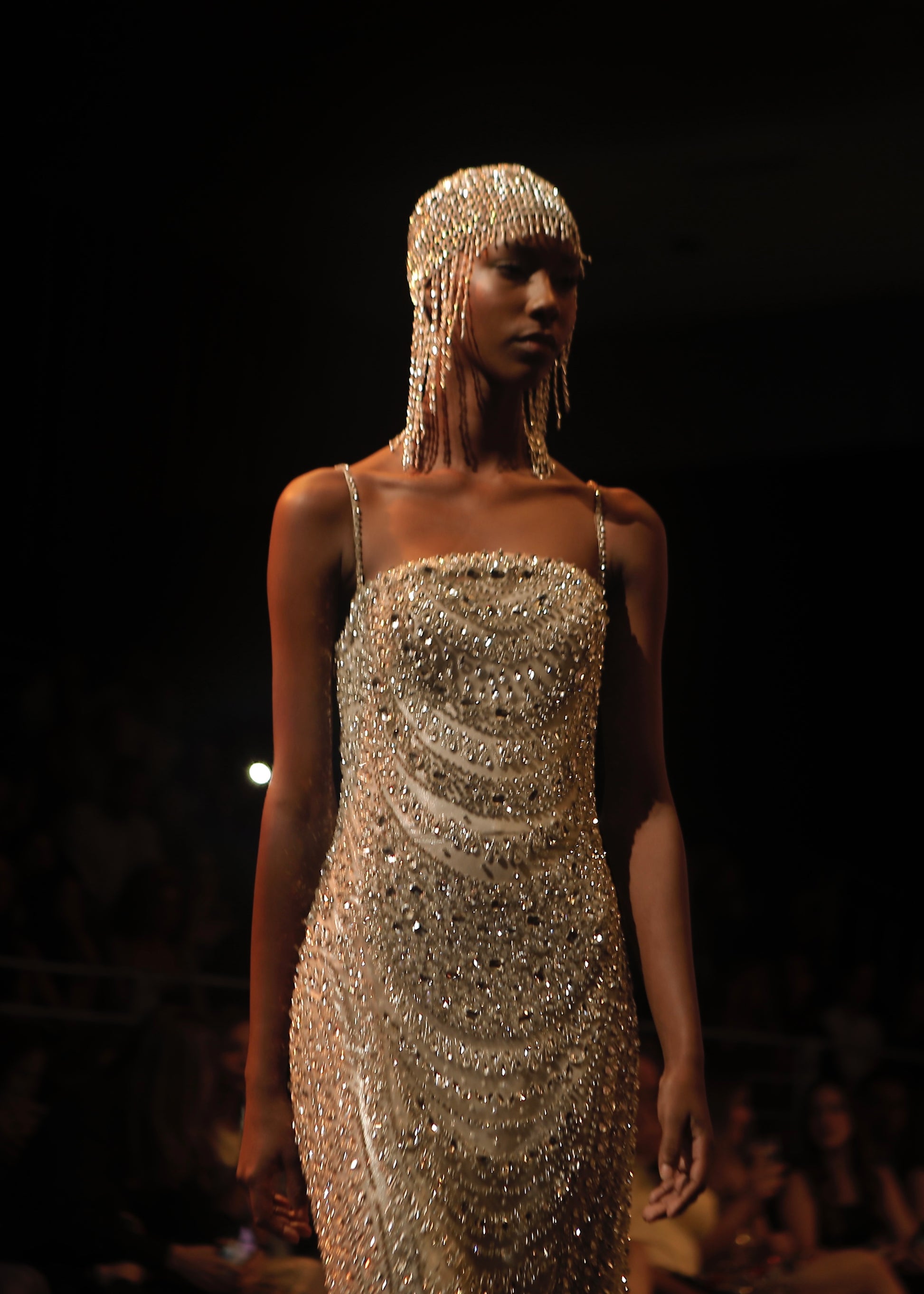 Vestido confeccionado en una base translúcida color plata, completamente bordado a mano con cristales y cuentas plateadas que crean un efecto de brillo sobre la piel. Su silueta columna y escote recto realzan la figura con sutileza, mientras los finos tirantes añaden un toque delicado y femenino.